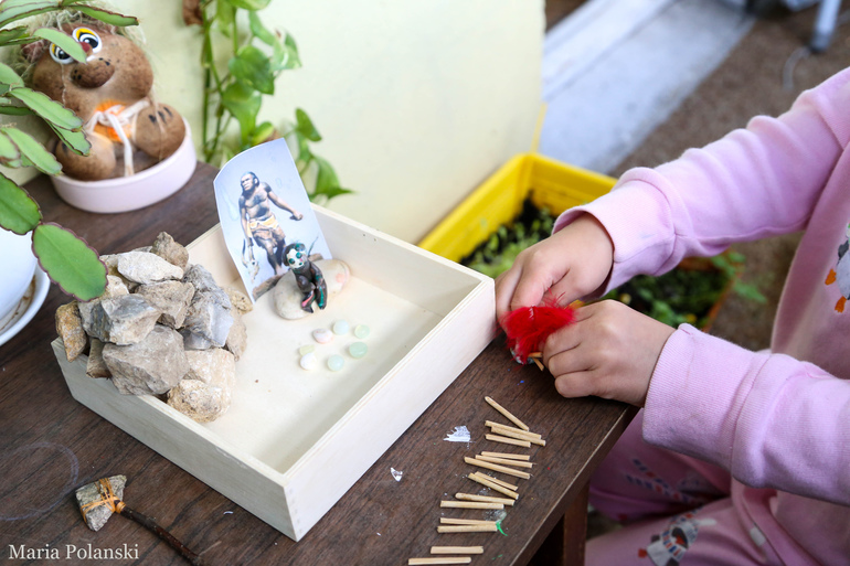 После этого мы собрали костер для нашего австралопитека, втыкая бревнышки (порезанные шпажки для шашлыка) в пластилин. А огнем у нас служило красное перышко.