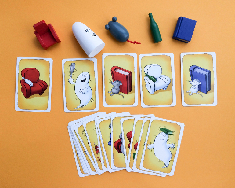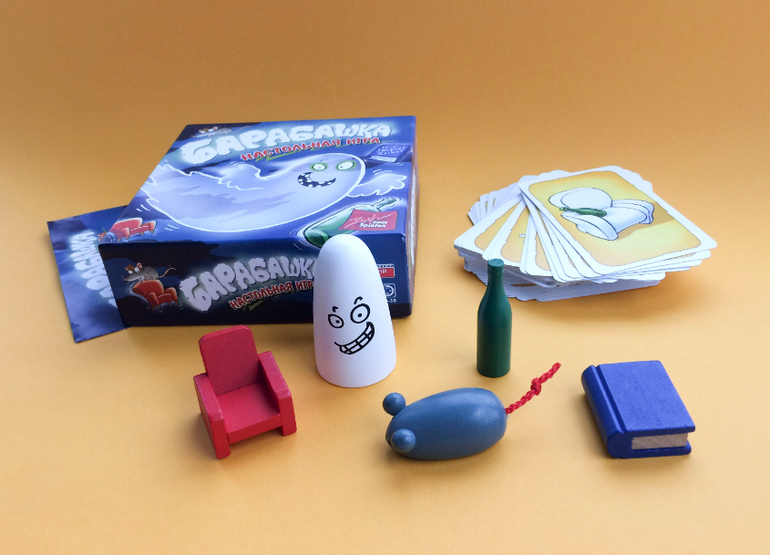 А вот если встретилась карта, например, с зелёной книгой и красной мышкой, работает правило несовпадений: мышка серая, так что её брать нельзя, книга - синяя, то есть, тоже нельзя. Зелёный цвет - это бутылка, а красный - кресло, поэтому эти два предмета тоже нельзя схватить. Остаётся белый Барабашка, вот его и надо хватать. Не так просто, как вы думали, правда? Зато безумно азартно и весело!"