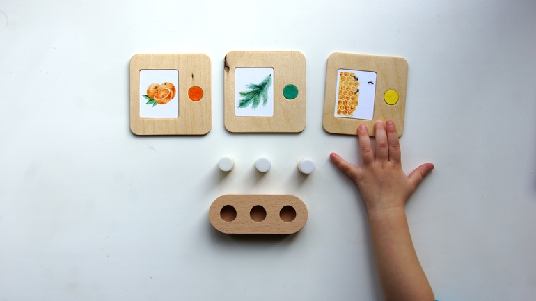 Так как для начала ребенка лучше всего знакомить с небольшим количеством ароматов. Мне показалось оптимальным число - 3. То именно под три аромата сделали и деревянные подставки. Таким образом у каждой баночки получился свой домик и они не скользят по подносу, когда его переносит ребенок.![]()