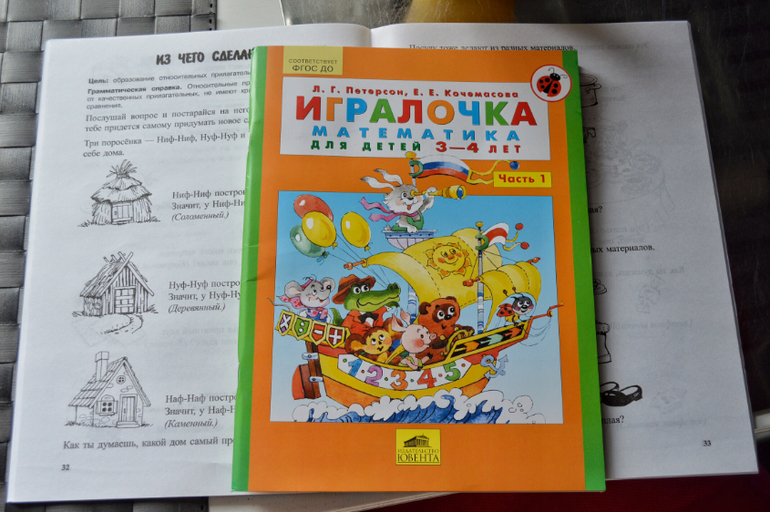 Дешевенькая тетрадочка Петерсон. К ней мы ещё не подобрались. Тетрадь требует ещё и подготовки родителя, а родитель пока время не нашёл. И какая-то она скучная мне кажется.
