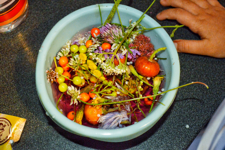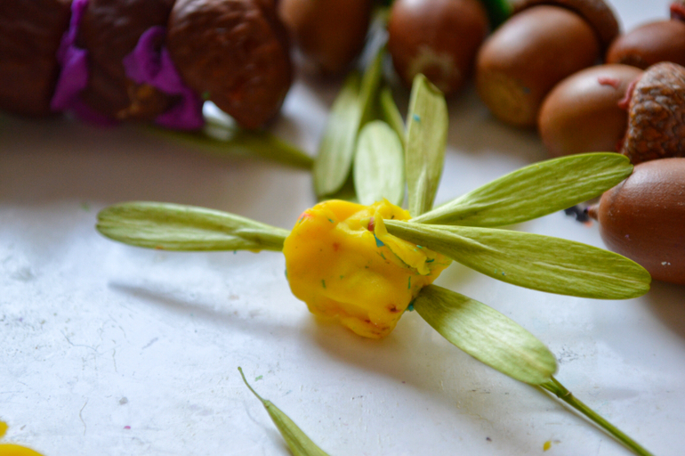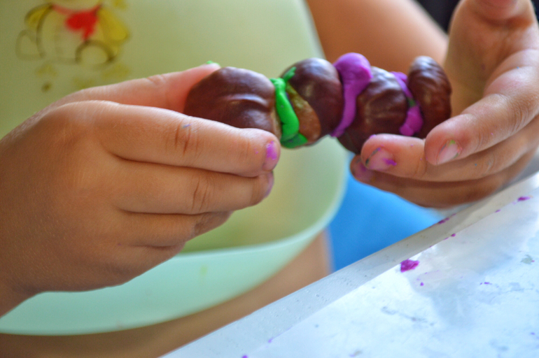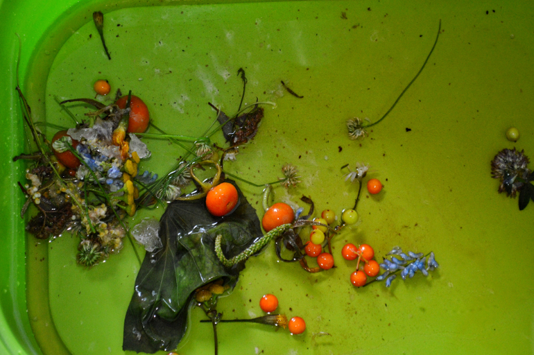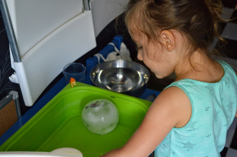Вообще наморозить можно все, что угодно. Летом листочки и ягоды, осенью жёлуди и каштаны, зимой еловые иголки, например. А потом лить на эту глыбу кипяток и смотреть как выплывают сокровища. Лучше конечно весь процесс проделать вместе: залить, поставить в морозилку, проверять замерзло ли , размораживать.