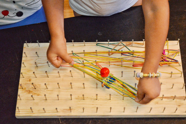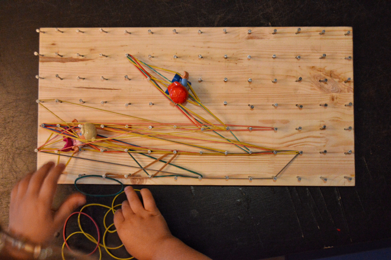 А это папина работа))- геоборд. Это традиционный Монтессори материал, который есть в любой группе. В ИГ можно купить эти доски. А можно за 15 минут сделать самим. Доска из оби, гвозди из коробки с балкона))