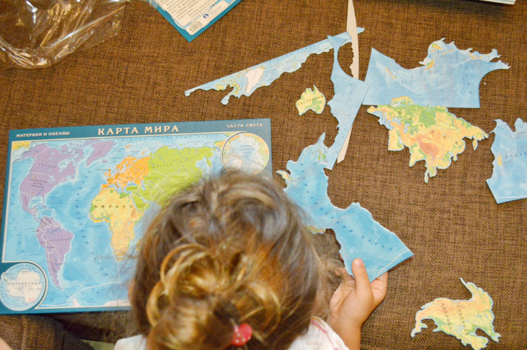 Мы по-прежнему интересуемся географией. Ещё летом купила пазлы. Континенты и Россия. Детали мелкие, поэтому пока собираем вместе. Но поскольку Дэрья, извините, сидя на горшке, выучила карту наизусть, она прекрасно представляет где располагается большинство стран. Так что эти пазлы ей интересны. Кроме того в рамках географии собираем 3-Д пазлы достопримечательности стран мира, поскольку комплектов Умницы абсолютно точно недостаточно.
