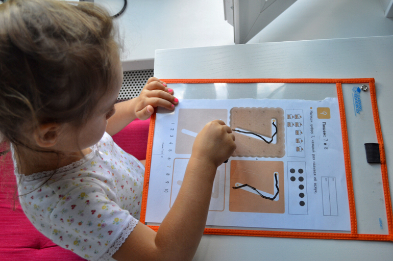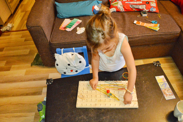 Предполагается, что ребёнок может делать фигуры из резиночек. Но Даша обычно фиксирует там фигурки, делает путь от одной до другой фигурки. В планах у меня ещё практиковать там счёт. И все-таки потренировать простейшую геометрию.