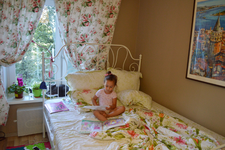 Утро, как правило начинается со стопки книг. Периодами. Пару недель может просить ей в кровать книги принести, потом сама отдыхает недельку, потом снова читает)) Благо литературы у неё много.
