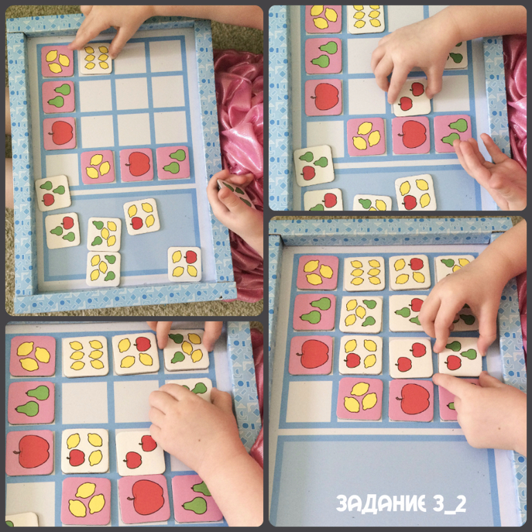 Задание 3 я дала сначала в упрощенном режиме не спрашивайте почему, иногда свои действия я с трудом могу объяснить самой себе, не то что другим и это оказалось элементарно из-за цвета (попробуй, спутай их!) и предмета (груша-лимон-яблоко). Это вам не какие-нибудь микроскопические с трудом различимые однотонные овалы с кругами. Так что этому заданию точно не больше 3+.