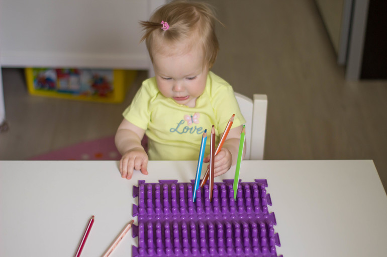 Втыкалки разные пробуем, например, в пластилин втыкали счетные палочки и трубочки для коктейля, или вот придумали карандаши вставлять в ортопедический коврик