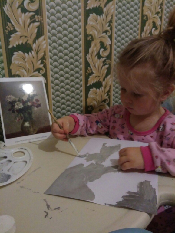 Художественно-эстетическое развитиеДавно не доставала . А сегодня вечером Слава попросила порисовать вместе и я решила совместить приятное с полезным) Из комплекта выбрали картину художника Анри Фантен-Латура «Цветы в вазе», рассмотрели ее и обсудили, что на ней изображено. И начали творить) Я безумно рада, что с каждым занятием дочка проявляет больше старания, почти все делает сама. Я объясняю, что нужно делать, готовлю материалы, а Славушка красит и клеит. Вот такая красота у нас получилась сегодня: