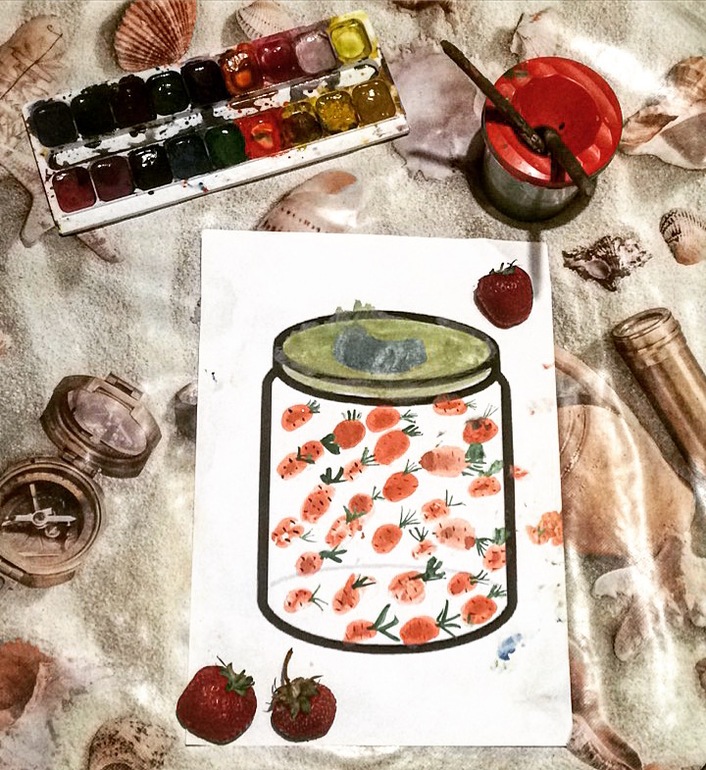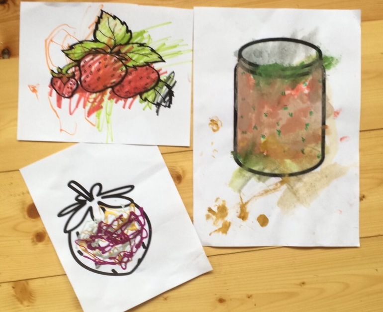 А еще раскраски обычные и не очень. Ну и банку с вареньем, где ягоды рислвали пальчиками. А потом начался творческий процесс.