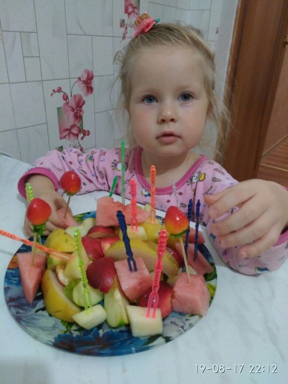 Следующее задание - красиво оформить фруктовую тарелку: помогала резать фрукты, накалывала на шпажки, раскладывала на тарелку, кормила папу))