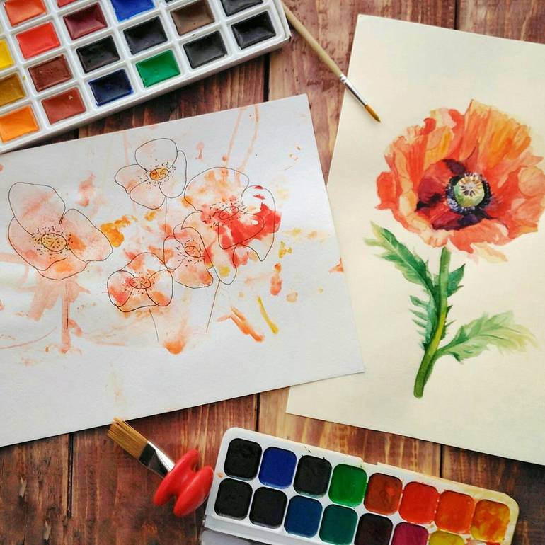 При помощи акварели можно делать интересные красочные эксперименты, которые не доступны с более плотными красками: например, намочить несколько цветов, дать ребенку в руки объемную кисточку и пусть макает-красит. Благодаря нечетким движениям, он захватывает сразу несколько красок, и отпечатки получатся радужными. Или намочите лист акварельной бумаги и предоставьте юному художнику наблюдать, как краска растекается по влажной поверхности и совсем иначе ведет себя на сухой. А потом можно посмотреть, на что получились похожими кляксы и даже обвести их. Вот такие акварельные маки у нас распустились по весне: справа - мой, слева - Маргаритины: