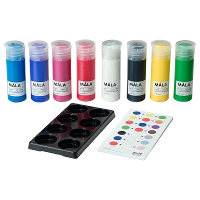 Когда Маргоша перестала есть пробовать на вкус краски, и нам захотелось расширить горизонты творчества, мы перешли на обычные акварель и гуашь. Ими гораздо удобнее рисовать при помощи кисточек и прочих устройств, так как консистенция более жидкая. Очень удобной для малышей оказалась гуашь (это ведь гуашь, да?) от Икеи: