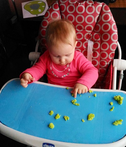 В завершении покажу нашу зону творчества. Сначала Марго рисовала и лепила в стульчике для кормления, так нам обеим было удобнее. Папа сделала нам подложку из двух слоев гофрокартона, обклеенного самоклейкой. Получилось весьма функционально: краска легко смывается губкой, столик всегда чистый, плюс к этой подложке есть возможность прикрепить лист бумаги, чтобы он не елозил во время занятия. На фото выше это голубая штука, на которой Маргоша лепит и рисует)))