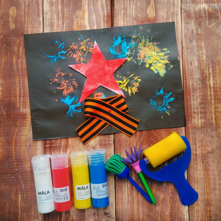 При помощи валиков и фигурных кистей мы рисовали, например, вот такую картинку к 9 мая. Звезду делали отдельно при помощи трафарета и валика, а фейерверк - фигурными кистями.