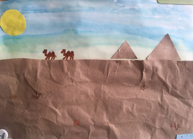 И пошли делать картину. Акварелью нарисовали небо. Приклеили мятую упаковочную бумагу. И все)) Пустыня она простая))
