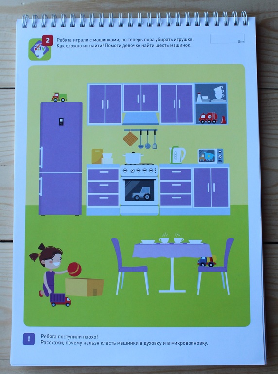 Вот пример задания на память. На одной странице требуется найти всех прячущихся детей и запомнить, куда кто спрятался. Очень здорово кстати, что в таких упражнениях еще и развивается речь и происходит усвоение дополнительных понятий пространства и расположения.