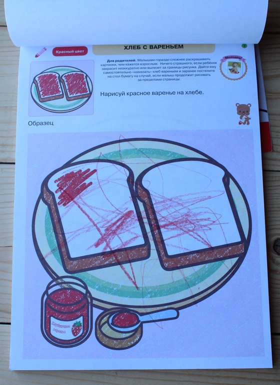 У Маргоши интереса к осмысленному рисованию всяческих кружков и линий пока не наблюдается, поэтому решила прикупить на пробу специальное пособие для развития графических навыков. На мой взгляд, оно очень интересное по своей структуре. Здесь постепенно, от простого к сложному, формируется навык рисования восковым мелком. Задания группируются по цветовому признаку. То есть сразу изучаются/закрепляются еще и понятия цвета. Так, начинается всё с красного: