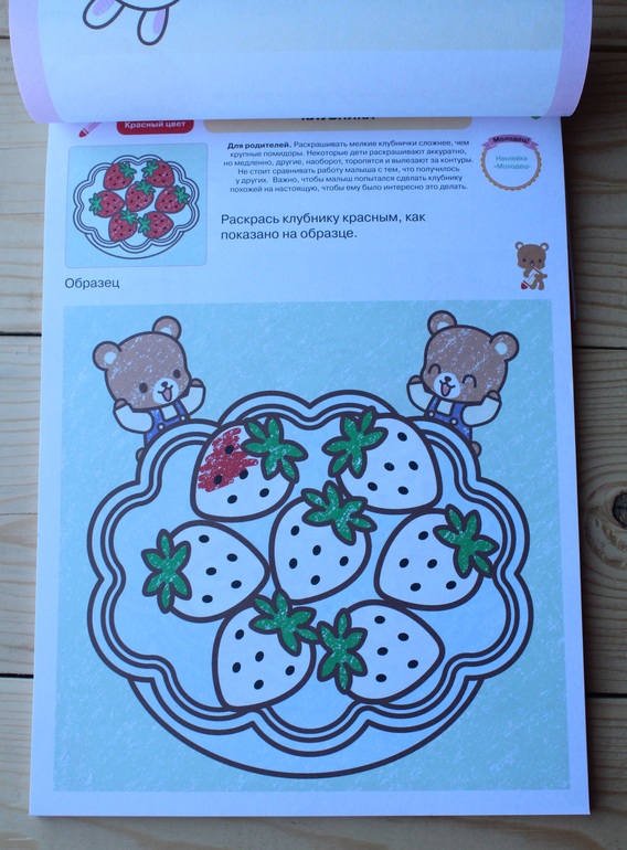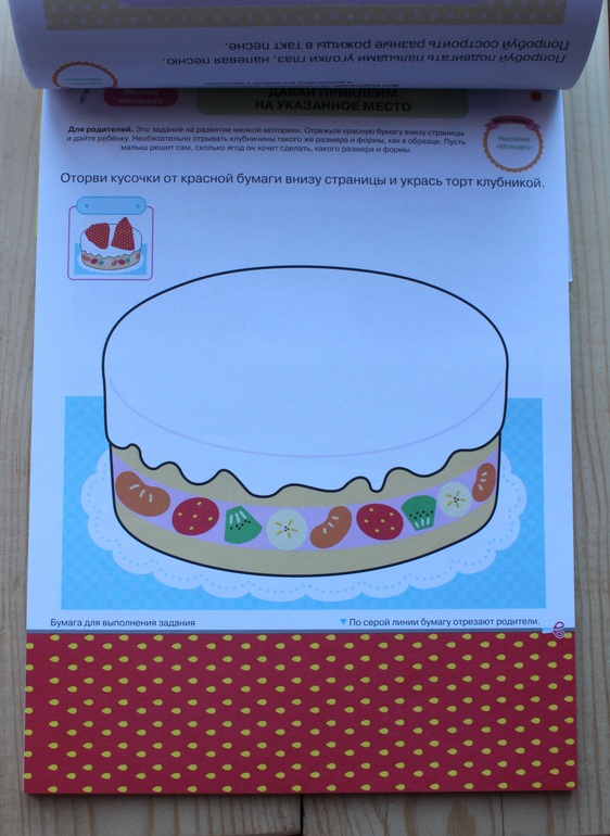 Пожалуй, самый главный фаворит на данный момент. Серия японских тетрадей Gakken включает в себя целый ряд пособий категории 2-4 года, но я взяла на пробу пока только 2. Хотим еще! Такие они оказались удачные и Маргоше подходящие. Формат А4 (как и всей четверки из обзора). Что очень здорово - задания очень разнообразно направленные. Например, есть аппликации (вот здесь нужно из бумаги внизу листа нарвать кусочки "клубники" и приклеить на торт: