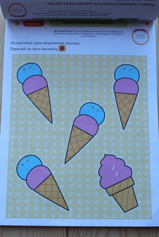 На логику (в примере нужно приклеить наклейку рядом с "лишним" мороженным):