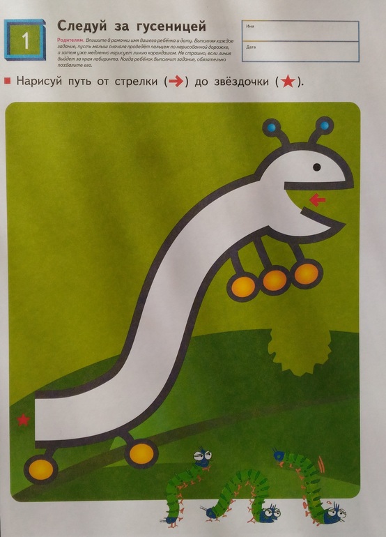 Отличительная особенность серии Kumon в том, что освоение навыка идет от простого к сложному. Этот принцип поддерживается и в тетради с лабиринтами тоже. Вот сравните, самый первый лабиринт предложенный малышу: