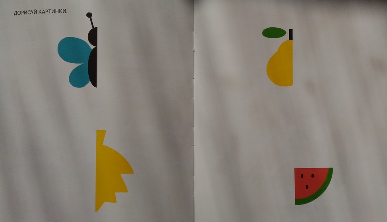 Что мне нравится, зачастую здесь творческий навык тесно переплетается с логикой, сообразительностью, вниманием. Вот например, здесь. Подобное упражнение можно встретить в других пособиях, но без предложения дорисовать. В основном оно звучит как: "Расскажи, что это? Чего не хватает?" и тп. Здесь же ребенок выполняет как бы 2 задания в одном. Собственно, сейчас мы многие как раз просто проговариваем, "решаем в уме". Когда графические навыки поспеют за соображалкой, будем рисовать.