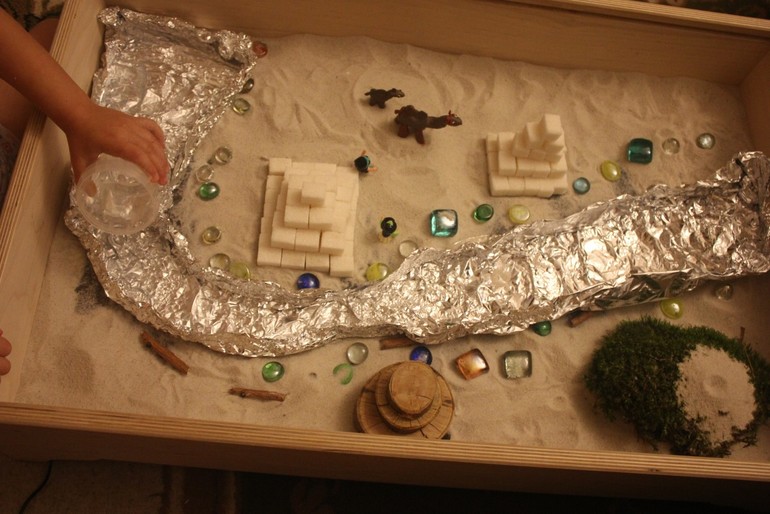 Пирамиды из сахар-рафинада, река Нил из фольги, верблюды из пластилина. Украшаем камнями, брусами, мхом и корягами. Наш песчаный мир готов!