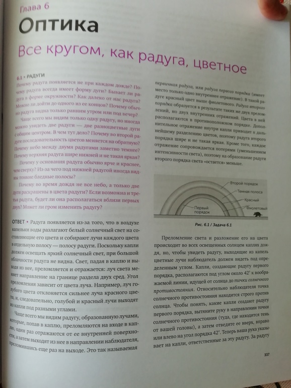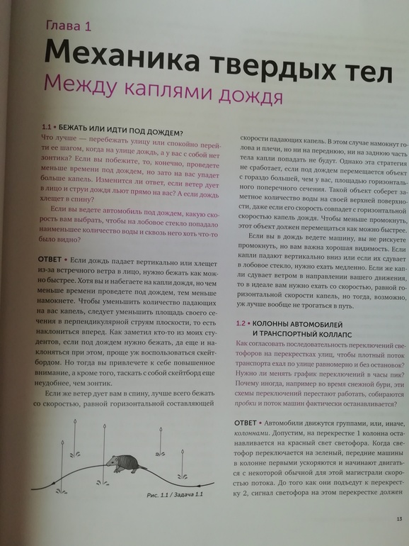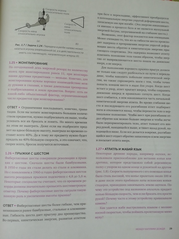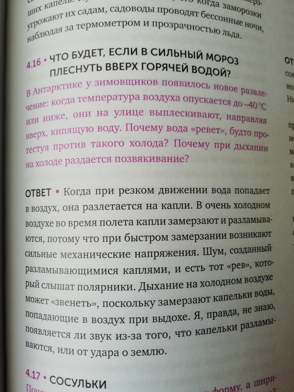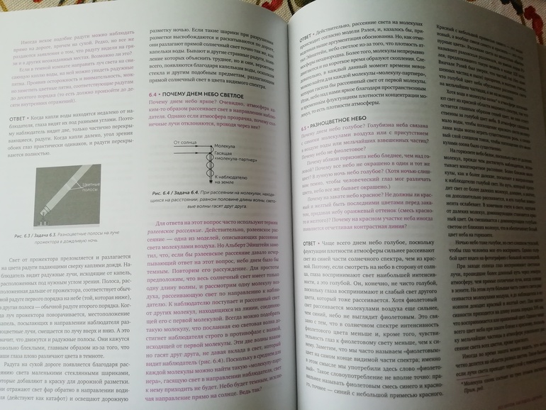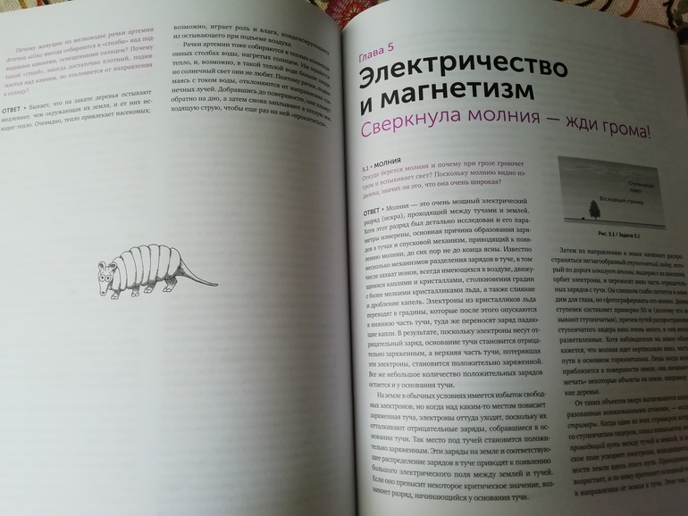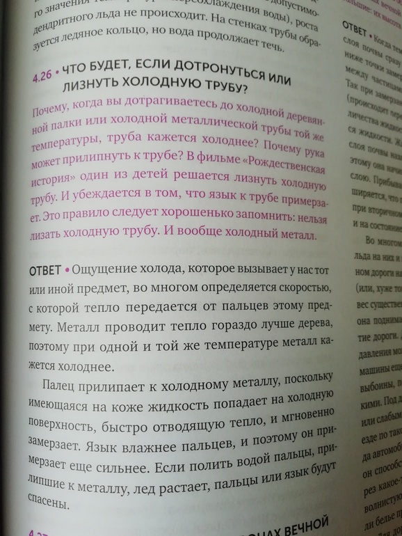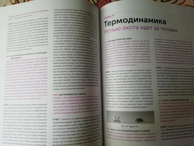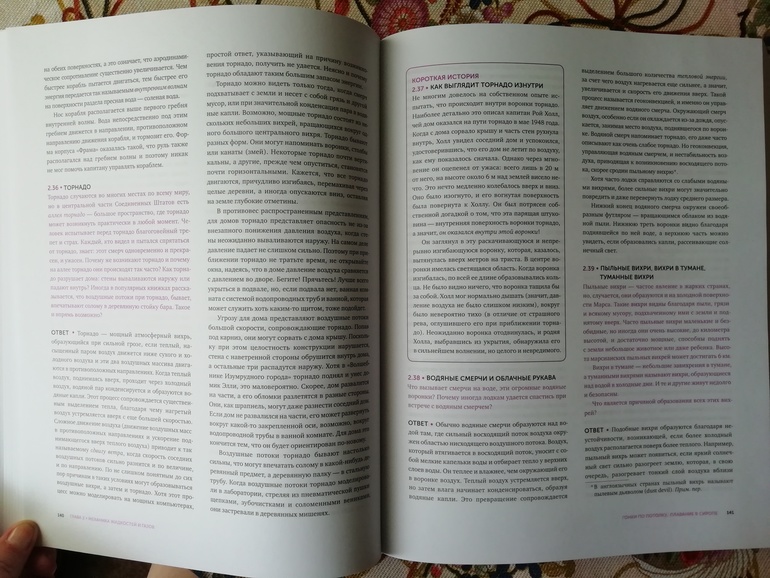 Эта книга не совсем об этом. Она о физике вокруг нас, о том, что нас окружает и почему так происходит. Если честно, мне она напоминает энциклопедию с вопросами. сначала дается вопрос и тут же ответ на него. Вопросы в книге выделены розовым цветом, ответы черным, к некоторым вопросам есть схемы, которые помогают лучше понять ответ.