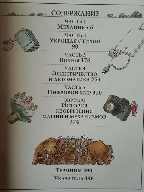 Книга состоит из пяти частей: Механика, Укрощая стихии, Волны, Электричество и автоматика, цифровой мир. Так же есть раздел с историей изобретения машин и механизмов, отдельно страницы с терминами и указателем.