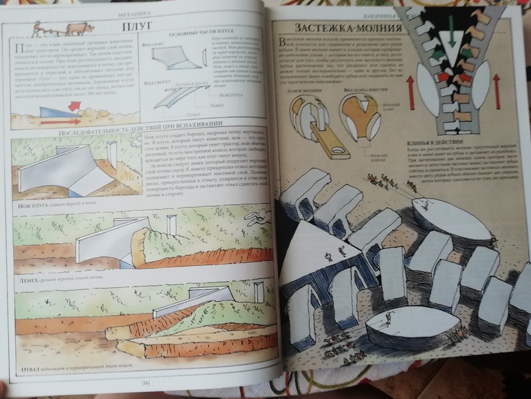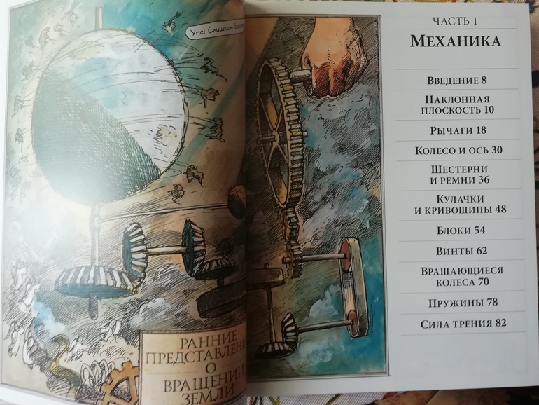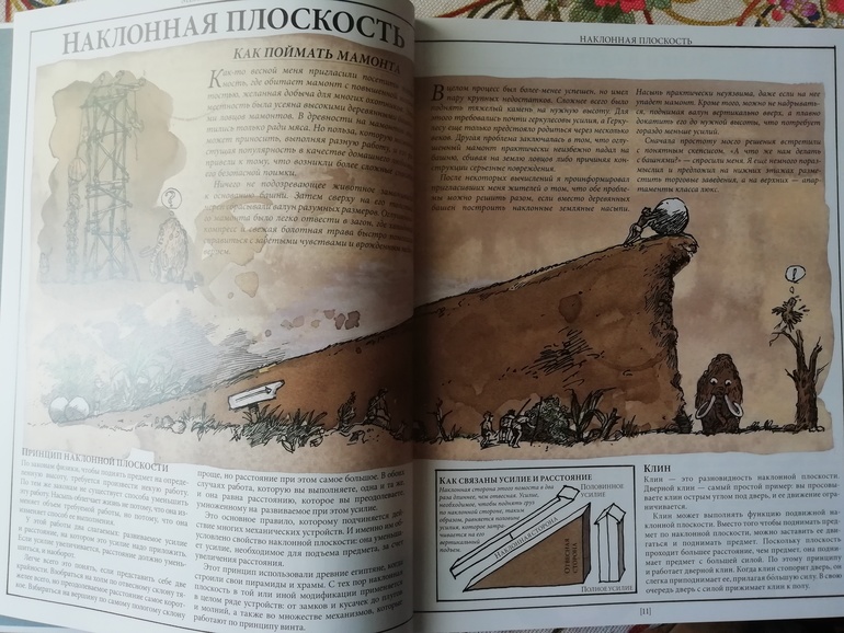 Текст в книге энциклопедический, но зато он сопровождается занятными историями про мамонтов. А вот над иллюстрациями можно зависать подолгу, разглядывая как устроены механизмы. По крайней мере, муж с сыном зависли надолго над этой книгой. Но это не означает, что девочкам она будит не интересна. Мы с дочкой тоже с удовольствием читали энциклопедию, истории про мамонтов и рассматривали строение механизмов. Я сама гуманитарий и мне понять что и как устроено крайне сложно.