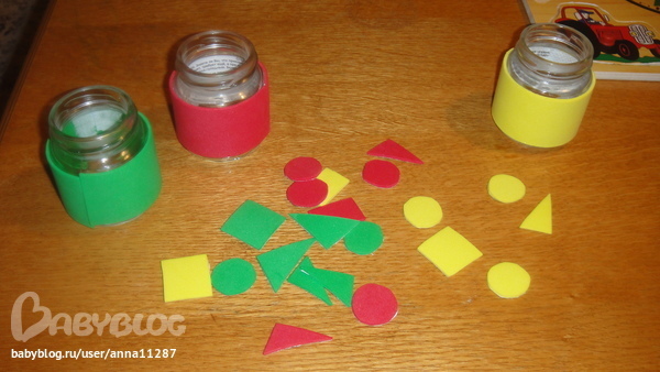 по разному пробовали уже цвета изучать, но результат пока меня не радует, поэтому придумала такие баночки. здесь заодно и формы проговариваем. это все тоже из листов пористой резины. Лерик их закидывает по цветам, а я контролирую и направляю. при отличном выполнении кол-во цветов будет увеличиваться.