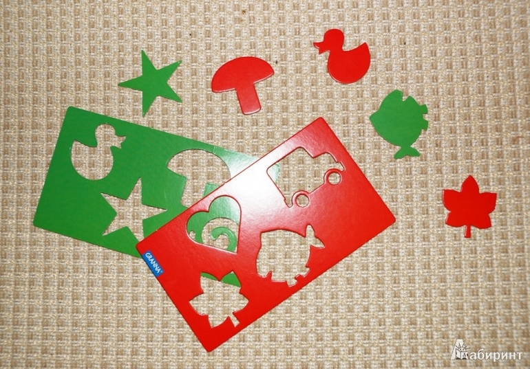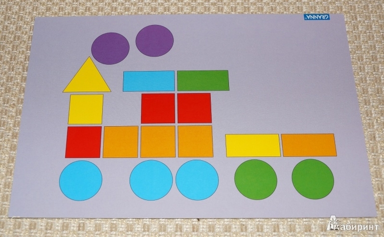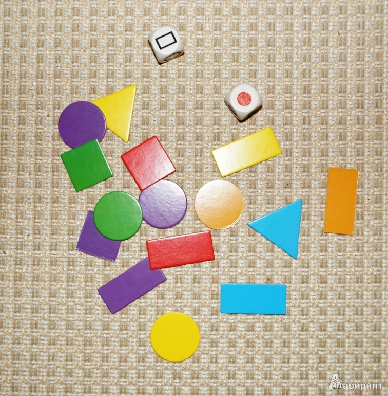В набор входят 72 разноцветные геометрические фигуры из картона, четыре дидактические карточки-поля и два кубика, один из которых с геометрическими фигурами, а другой с различными цветами.