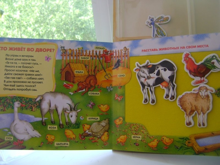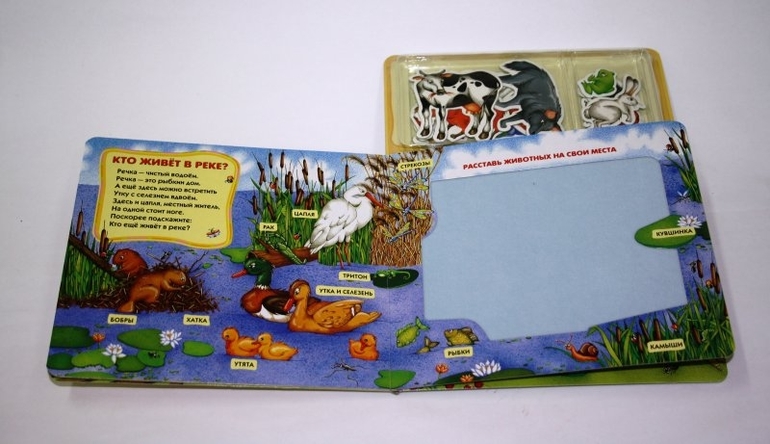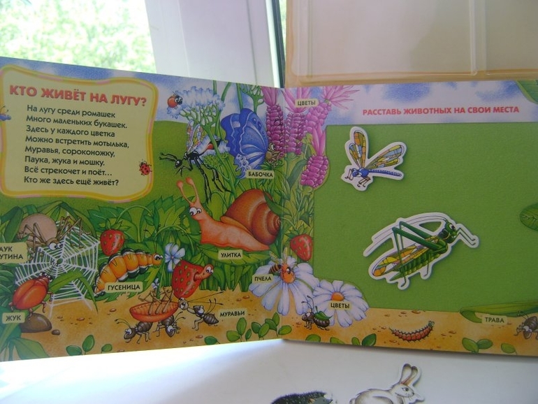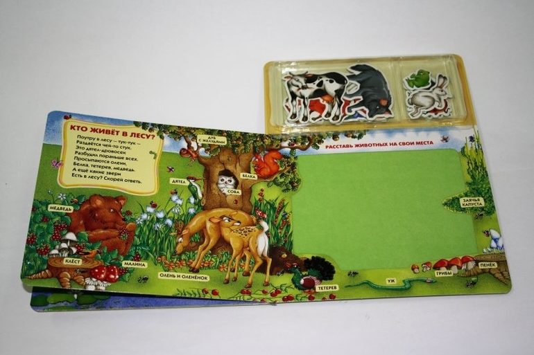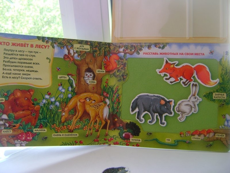 Развивающий материал (полезные развивающие игрушки)Много нового и интересного обещает рассказать эта книга и свои обещания, по моему мнению, она выполняет. Ребенок с ее помощью может узнать, кто живет в лесу, на лугу, на ферме и в пруду. На развороте книги на одной странице нарисованы обитатели этих мест, а на соседнюю фланелевую страничку ребенок может сам прикрепить любое животное или насекомое в зависимости от места его обитания.