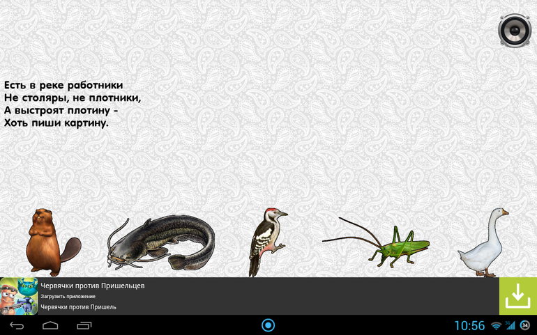 Для того, чтобы легче было отгадывать внизу даны картинки животных-насекомых-рыб. И при неправильном ответе животное все равно озвучивается, но говорится "Не верно". А при правильном ответе это животное появляется справа от стихотворения, в крупном виде!