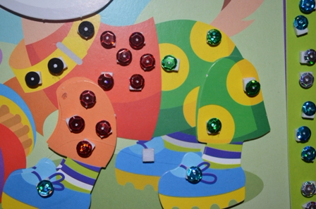 Все пайетки мы высыпали вместе в тарелку, и это не так-то просто как кажется взять в руки нужную. Движения ПАЛЬЦЕВ рук ребенок должен координировать ПОСТОЯННО!!!