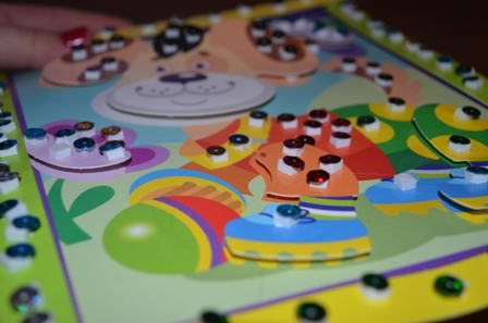 Единственное в чём я ей помогала - приклеивала клейкие квадратики, в чем сложность - это после того как они на месте, нужно снять верхнюю НЕКЛЕЙКУЮ часть, а у дочки это получалось либо ооочень медленно, либо вообще никак. Поэтому, сразу после открытия коробки и начала работы интерес как-то поугас, а когда я начала помогать с неподдающимися квадратиками, радости не было предела!