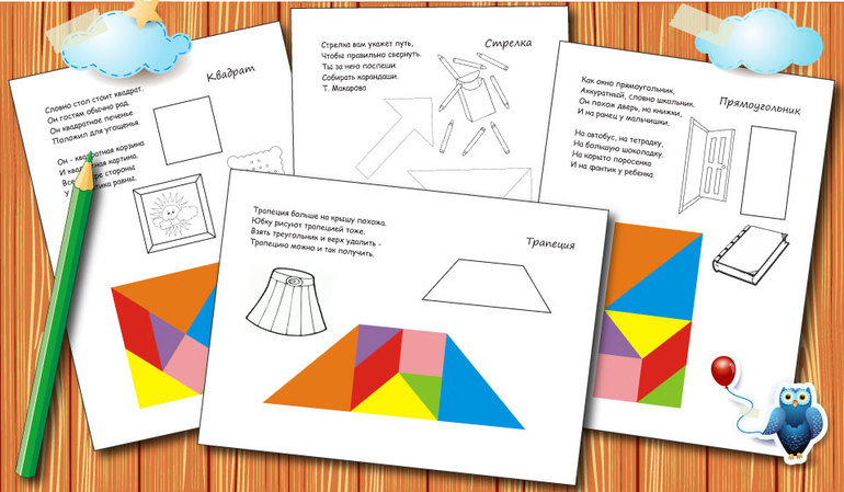 - Рисунок рядом с каждой схемой помогает ребенку увидеть, что он собрал из танграма и тем самым способствует развитию воображения.