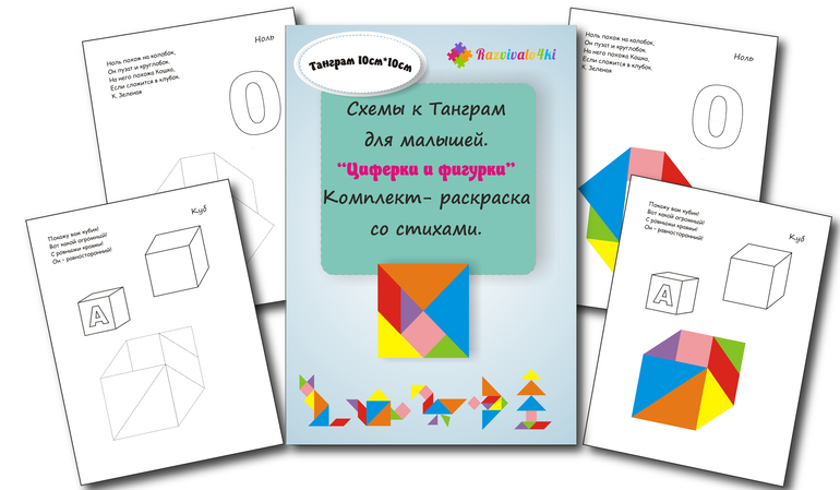 ссылки на материалКомплект-раскраска со стихами «Циферки и фигурки» подойдет детям от 1,8 лет. На каждой страничке - новое занятие, на котором предлагается собрать из фигур танграма различные картинки.