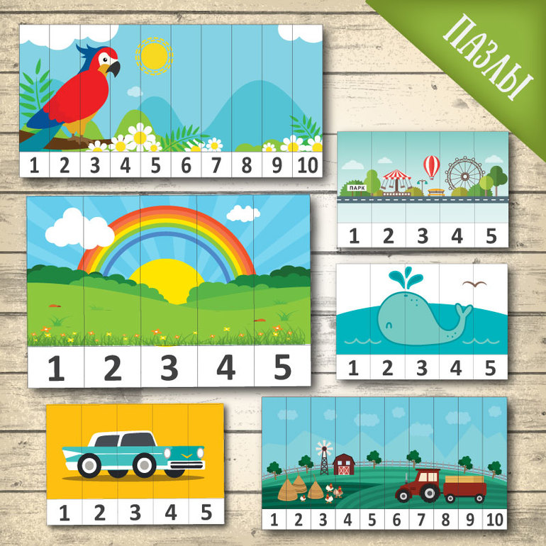 5 пазлов с цифрами 1-10 (каждый пазл на странице А4)