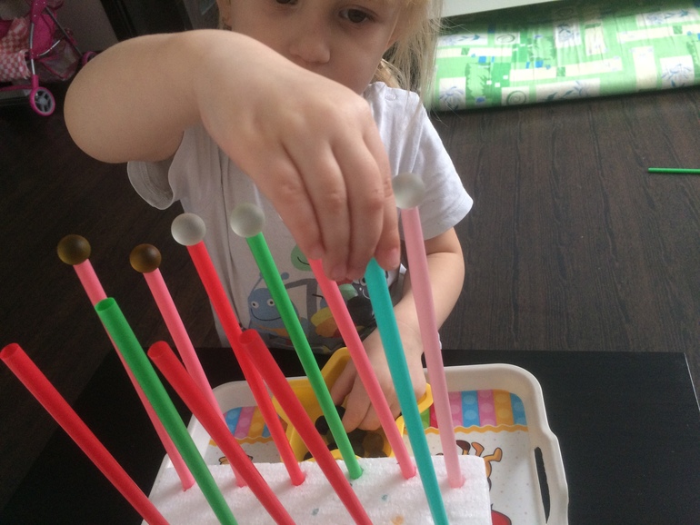 Игра на координацию движения, ловкость ручек и аккуратность. Берем пенопласт, трубочки широкие ( у нас икея) и шарики. В пенопласт вставляем трубочки и предлагаем ребенку установить шарики на трубочки .
