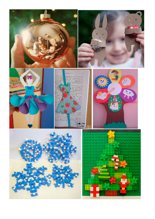 Нарядить елку и устроить семейную фотосессию на автоспуске - очень весело!!! Затем идут - упаковки для конфеток, игрушка на елку в виде балерины, закладка для книги, часы для указания погоды, игрушки из Лего на елку и не только, картина из полос разной текстуры и цвета, елочки из конуса и ниток.