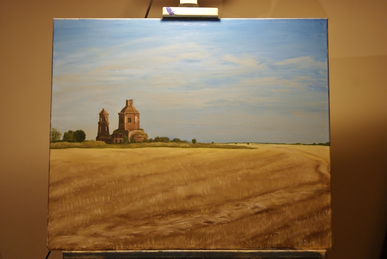 ПейзажКартина написана с моей фотографии, очень интересный пейзаж, по среди поля стоит одинокая церковь и будет стоять еще много много лет, как память ушедшим векам.