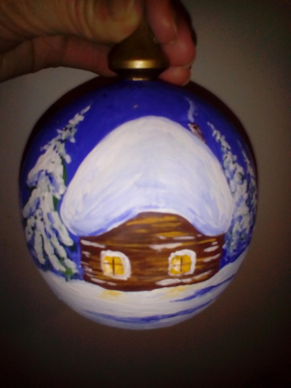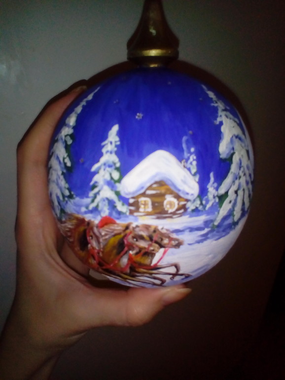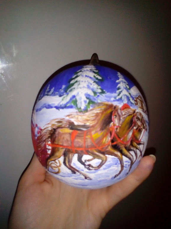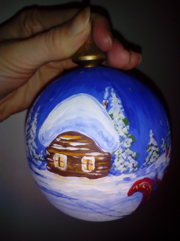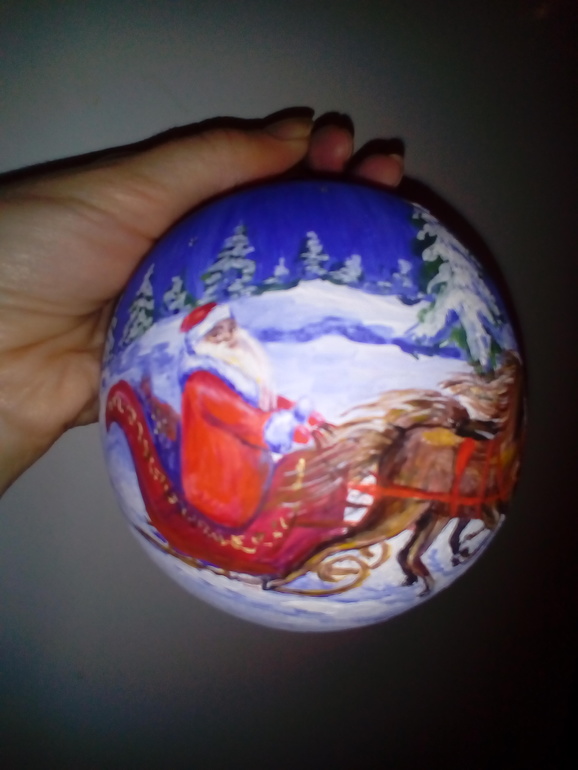Да, роспись на деревянной заготовке, еще и разборный. Открывается, получаешь 2 части, в одну можно немного конфет положить. Вот такой шар с сюрпризом, уехал в соседнюю область, в магазин, надеюсь кто-нибудь купит в предверии праздников.