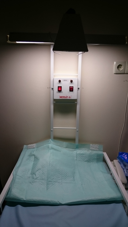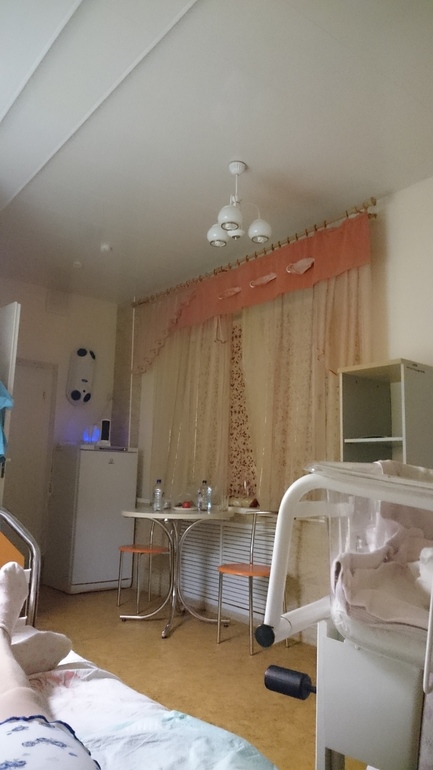 *2 местная комфортная палата (2 кровати, 2 тумбочки, холодильник, чайник, столик, душ в палате. Туалет в отдельном помещении, там стоят кабинки. Номер кабинки соответствует номеру палаты. То есть туалет один на вас и соседку, но не в палате, а отдельно. Девочки, необычный пеленальный столик с лампой подогрева. Это вещь! Детка не мёрзнет, пока пеленаешь, обрабатываешь. Помним про первомам.... таких как я, кто делает это впервые, долго и коряво…