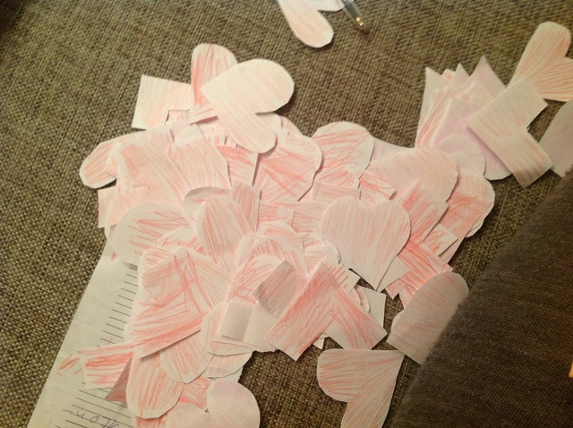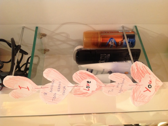 Я делала что-то в этом роде тож) нарезала несколько сотен сердец на каждой написала причину,почему Он такой сочный..и насыпала во все карманы,пальто,ботинки и тп,а в сумку большую открытку)) вобщем..весь день на работе находил в самых разных местах..)) но дома лучше всеж.....не додумалась...реакцию видно)))