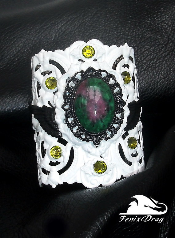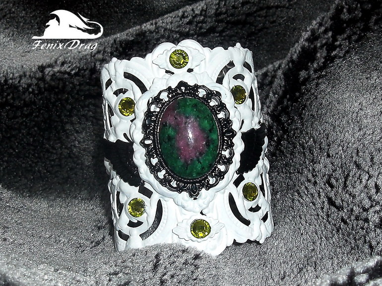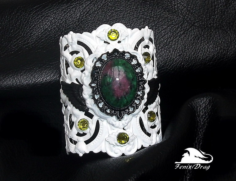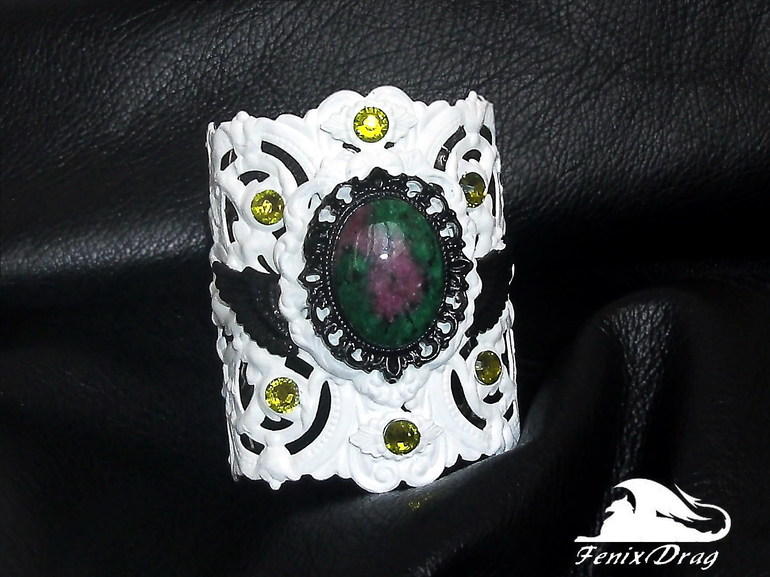 Изготовлен из винтажной латуни высокого качества. Внутренняя часть - покрытие серебром, внешняя - белая эмаль. Основной камень - рубин цоизит. Так же на "крыльях" и обрамлении основного камня использовалась латунь в покрытии черной эмалью, стразы Сваровски.