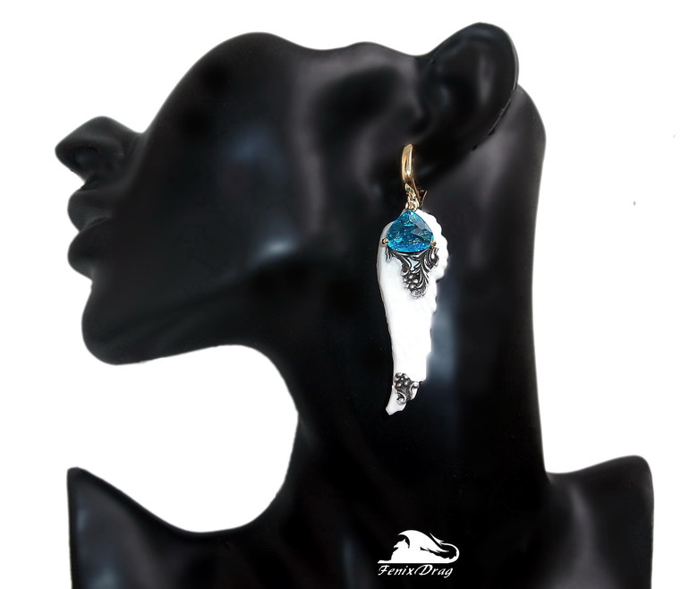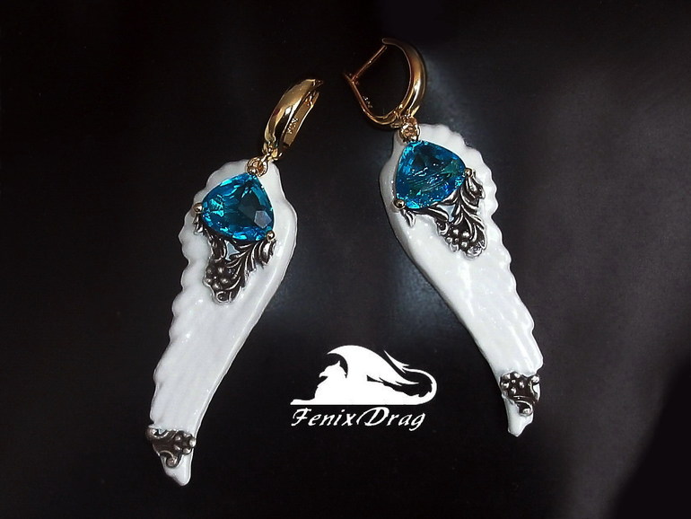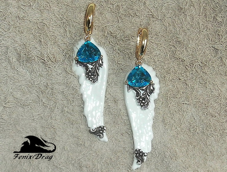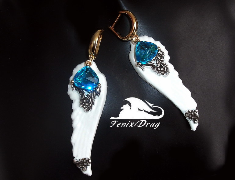 Серьги "Белые крылья ангела" длинные с голубыми ювелирными вставками "сапфир" в Винтаж, Стимпанк сти