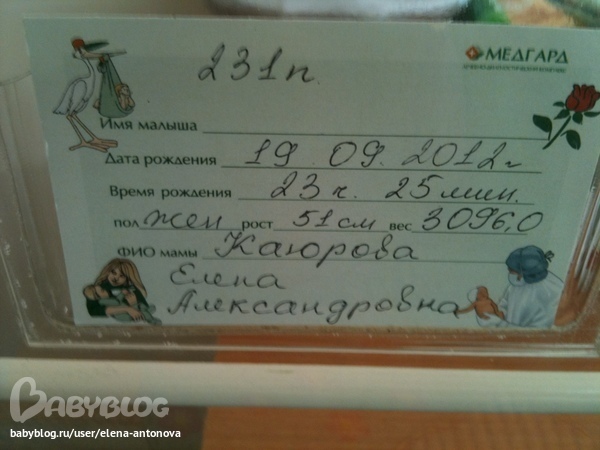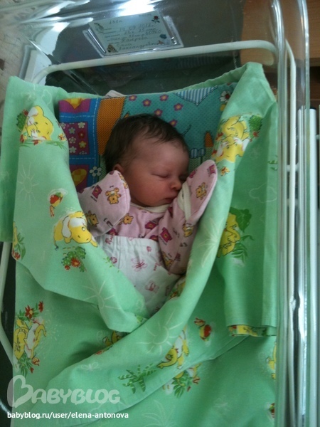 Новый год встретили хорошо,под бой курантов я в который раз загадываю желание (кстати,пару прошлых лет загаданные желания чудесным образом сбывались,хоть и казалось,что это просто не может сбыться.А нет,сказка в Новый год все-таки есть).В этот раз я загадала...дочку!маленькую карапузину,чтоб нашей семье Бог подарил в 2012 году чудесный кулечек с длинными ресничками.Про реснички он не забыл,они действительно длинные))) Праздники прошли бурно,потом я вышла на работу...17 Января должны были прийти М..Но что-то не идут.Задержки в несколько дней у меня случались часто,я не придавала этому особого значения...но не в этот раз.Что-то дернуло меня метнуться в аптеку за тестом..19 января,рано утром в ванной я проделала с ним все нужные процедуры,еще полусонная и особо не понимая,что происходит,взглянула на результат..Подумала ,что у меня спросонья двоится в глазах...Там // !!!! Я,по-моему,даже не успела надеть труселя,побежала в комнату будить спящего мужа и сообщать,что он скоро станет папулей)Он сонно обрадовался,и был в счастливом ожидании последующие 9 месяцев,во всем меня поддерживая,ходил на все узи и был примерным семьянином.Беременность моя проходила отлично,я до последнего работала,на 9-м месяце умудрилась прискакать на работу,коллектив уже привык к моей активности и тихо удивлялся. Итак,ближе к делу..В ночь с 18 на 19 сентября что-то нам с мужем не спалось.У меня потягивало поясницу.В этот день я как чувствовала одним местом,что должно что-то приятное произойти,дособирала сумку в роддом,но было как-то беспокойно.На часах 12 ночи..я пошла,нет..покатилась колобком в туалет (ах,в беременность это место было так часто посещаемо,как и кухня с холодильником).ну так вот увидела я на ежедневке пятнышки непонятного содержания,поняла,что отходит пробка.Потом в течении часа из меня потекла водичка,совсем немного..но я знаю,что в этом случае пора в роддом.Я решила полежать и понять свои ощущения..тянуло поясницу,появились схватки...пока еще слабые-слабые,периодичность 9..10...15 мин.Короче,в эту ночь мы с мужем знали,что поедем в роддом,но лежали оттягивали удовольствие,смотрели на компе "Реальных пацанов"))) Ближе к 5 утра я решила,пора.Роддом в 10 минутах от дома,мы домчались еще быстрее по пустым улицам.Там меня осмотрели сонные врачи,очень болюче,у меня прям искры из глаз полетели вместе со слезами,на что врач пробубнила:Девочка,как же ты рожать будешь! как,как..как и все,уже не рассосется)))да и из роддома меня уже никто не отпустит,тем более я сама решила:отсюда я выйду только с кульком реснитчатым по имени Настя.Мужа я отпустила с ревом,и пошла на клизму.А потом 40 минут сидений в позе орла и смс с мужем,душ и родовый зал.Открытия 0,шейка не готова,но родовая деятельность хоть и слабенькая началась.Врачи,узнав,что я эту ночь не спала,скомандовали акушерке вколоть мне какой-то снотворный укол и попросили меня поспать и набраться сил.Схватки стали в этот период немного ощутимее, 5-6 минут.Спать не получалось...время 10 утра.Эх,я рожаю и не могу в это поверить.Обещали,что сегодня рожу...Ждем-с.. Периодически приходила врач проводила осмотры...Охохо,эти осмотры,для меня не было в родах ничего страшнее их,какое-то издевательство,хотя может я такая неженка.Через некоторое время решили стимулировать,окситоцинчик родненький,я тебя никогда не забуду)До самого конца он вливался в меня...