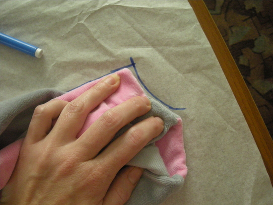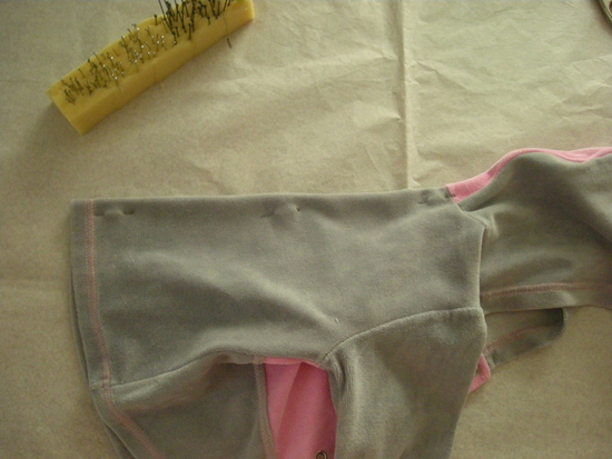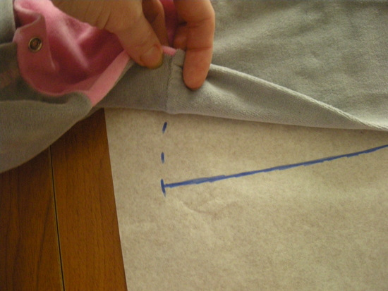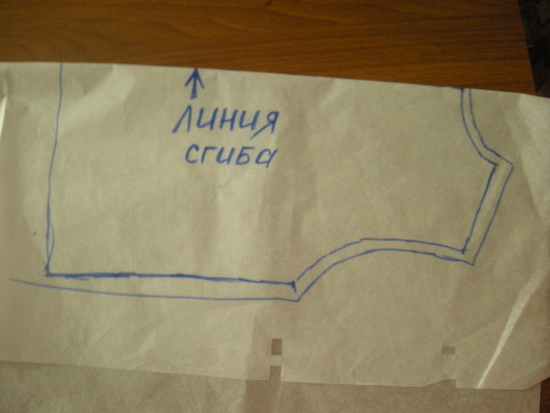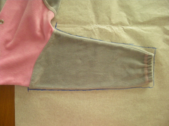 Беру подходящую по размеру ребёнку кофту, закалываю по середине спинки, чтобы не ошибиться с линией середины, потом обвожу на бумаге.