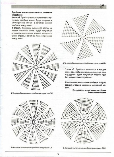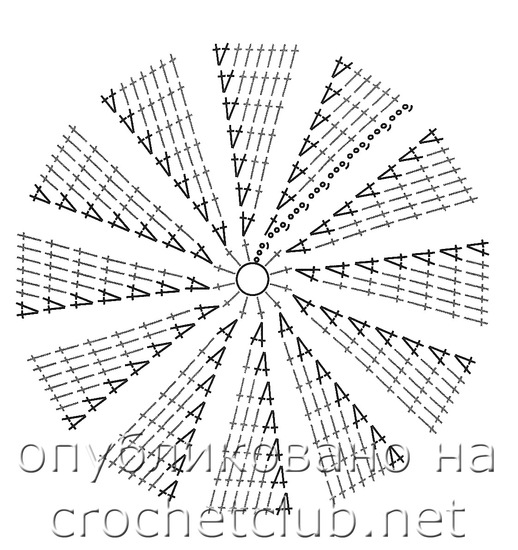 а я круг вяжу всегда так,сначало шесть петель,потом в каждую по две,потом через одну прибавка ,потом через две,через три и так далее.