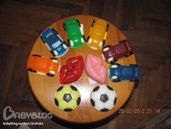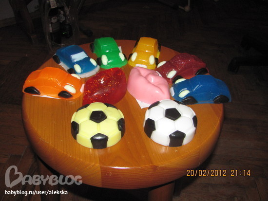 Мыло и косметика своими рукамиВот такие наборчики наварились на заказ, всего было по 6 шт каждого вида. Вроде и с заливкой мячиков приспособилась.